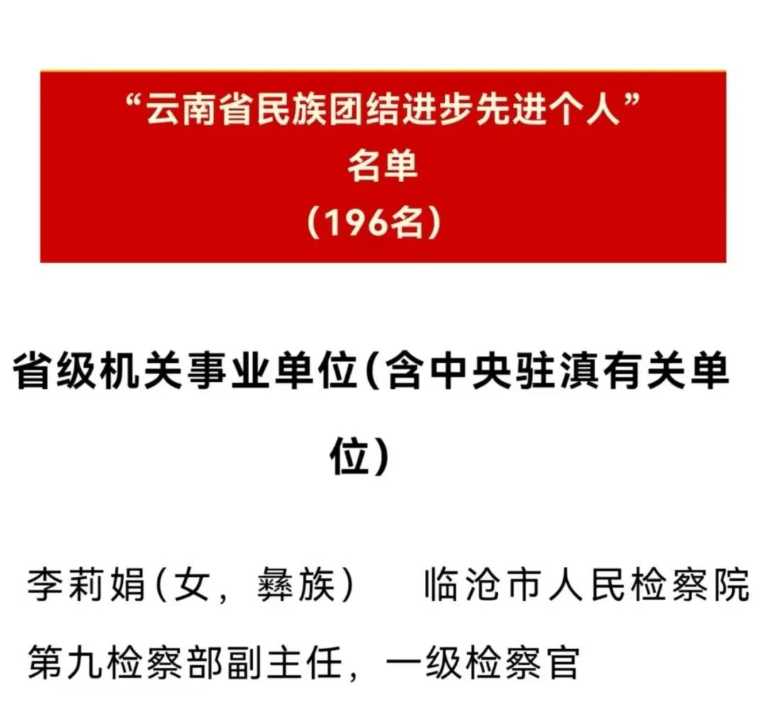 临沧市人民检察院李莉娟同志被授予“云南省民族团结进步先进个人”称号!