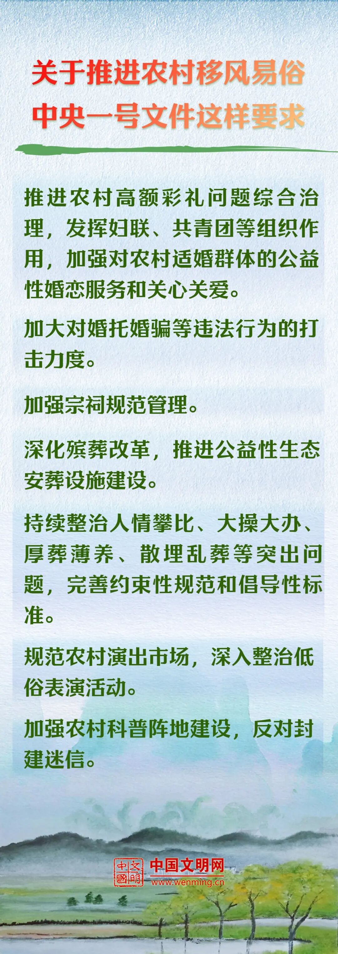 2025年中央一号文件《中共中央 国务院关于进一步深化农村改革 扎实推进乡村全面振兴的意见》2月23日正式发布,共包括持续增强粮食等重要农产品供给保障能力、持续巩固拓展脱贫攻坚成果、着力壮大县域富民产业、着力推进乡村建设、着力健全乡村治理体系、着力健全要素保障和优化配置体制机制等六部分内容。在着力健全乡村治理体系中,对于“推进农村移风易俗”提出了明确要求。