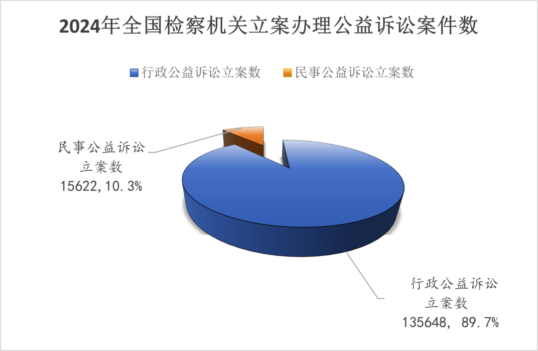 2024年,全国检察机关共受理公益诉讼案件线索160973件,其中,民事线索16738件,占受案总数的10.4%;行政线索144235件,占89.6%。共立案151270件,其中,民事立案15622件,占立案总数的10.3%;行政立案135648件,占89.7%。立案总数同比下降20.3%,办案规模更加注重有质量的数量,在质效优先导向下确保稳健。自2017年7月检察公益诉讼制度全面推行以来,全国检察机关共立案办理公益诉讼案件超过110万件,为完善公益诉讼制度积累了丰富的实践样本。